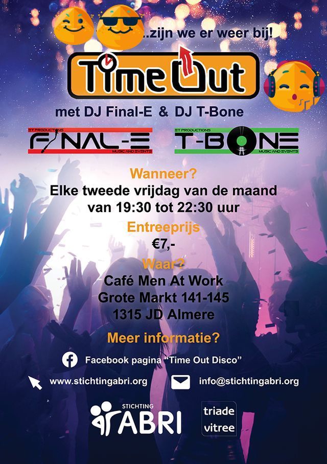 Iedere 2de Vrijdag is er weer een Time Out Disco feest. Let op: kosten €7,00 daar krijg je dan ook een drankmuntje bij. Betaal je €10,00 dan krijg je 3 drankmuntjes. Wel graag gepast betalen, je kan bij ons niet pinnen. Bestel op tijd jouw taxi terug dus kwart over tien. Heel graag tot dan,